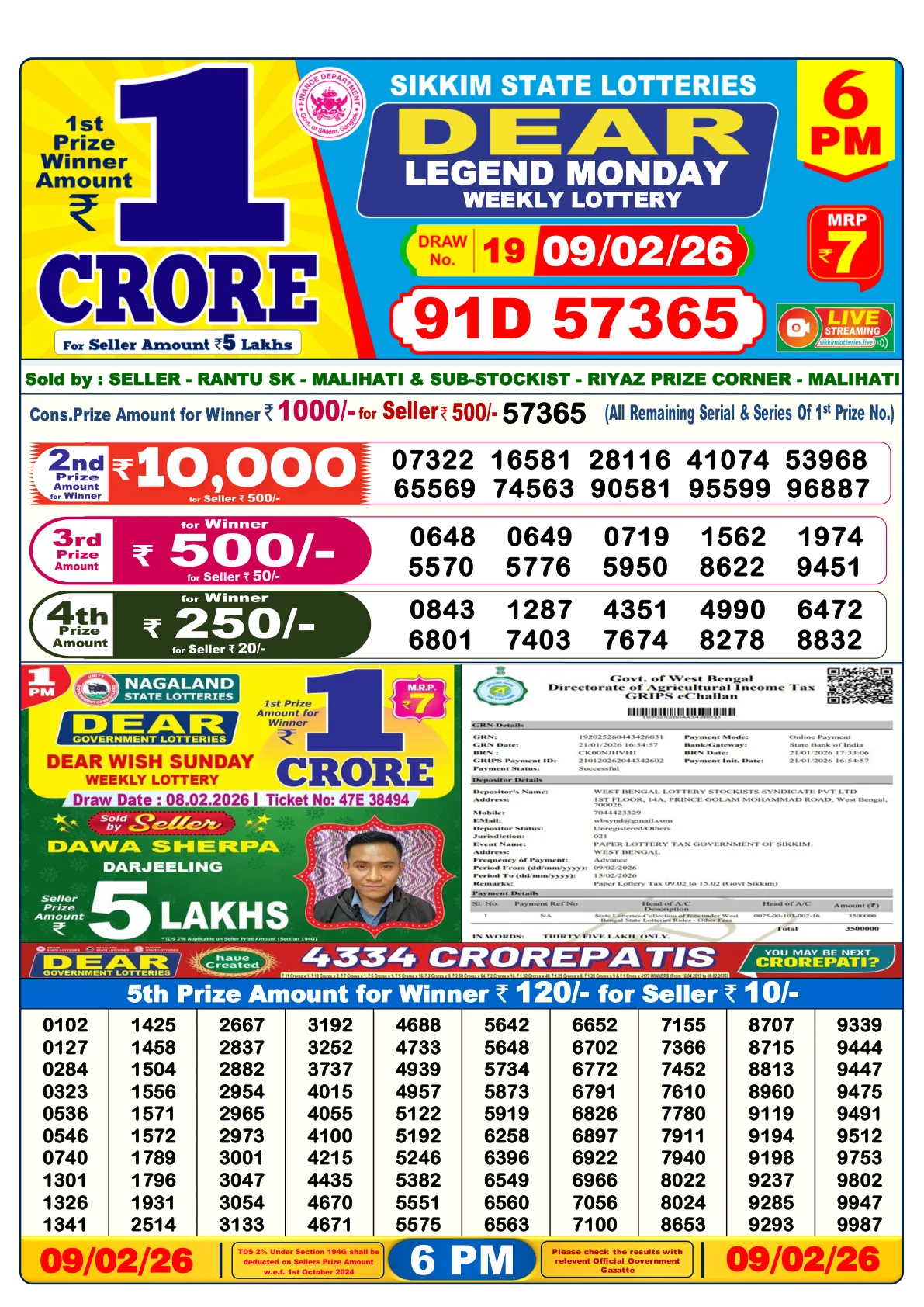 Nagaland State Lottery: Dear Legend Monday Unveils 91D 57365 as Top Winner!
