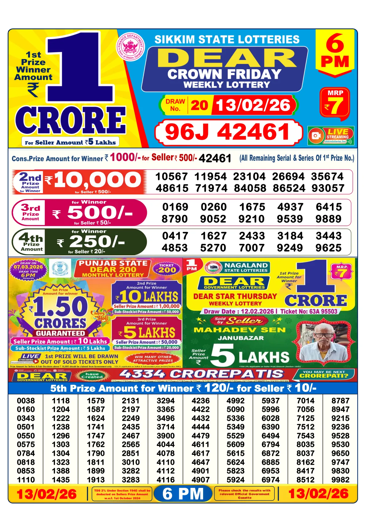 The highly anticipated Nagaland State Lottery's 'Dear Crown Friday' draw, held on the auspicious 13th of February 2026, has once again transformed lives, igniting hopes and fulfilling dreams across the nation. Enthusiastic participants eagerly awaited the results, and the moment of truth has delivered a truly exciting outcome.