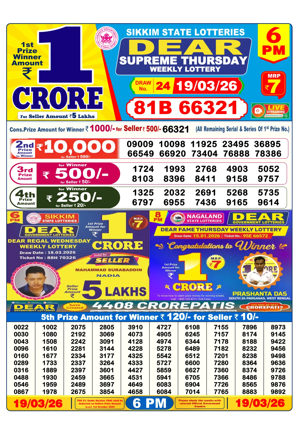 The anticipation reached its peak as the results for the 'Nagaland State Lottery - Dear Supreme Thursday' draw, held on 19th March 2026, were officially announced! Dreams transformed into reality for many fortunate participants. The lottery, known for its transparency and substantial prizes, once again brought a wave of excitement across the nation.