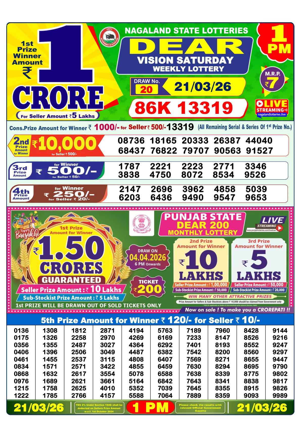 The much-awaited results for the Nagaland State Lottery's 'Dear Narmada Saturday' draw on March 21st, 2026, have been officially declared, creating ripples of excitement across the nation. The draw saw fortunes change hands, with one lucky ticket holder securing the coveted 1st Prize, bringing an incredible start to their weekend.