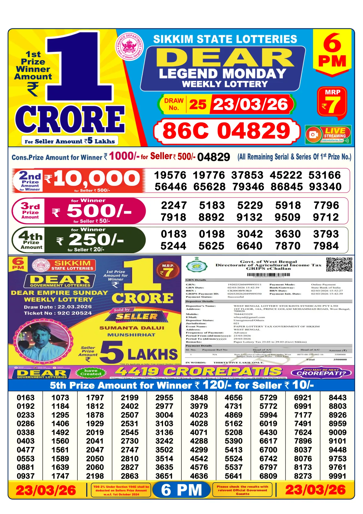 The eagerly awaited results for the Nagaland State Lottery's 'Dear Legend Monday' draw, held on March 23, 2026, have been officially declared! Dreams have taken flight for a select few, as participants across the country checked their tickets with bated breath. This draw, as always, brought with it a mix of excitement and anticipation, culminating in moments of pure joy for the winners.