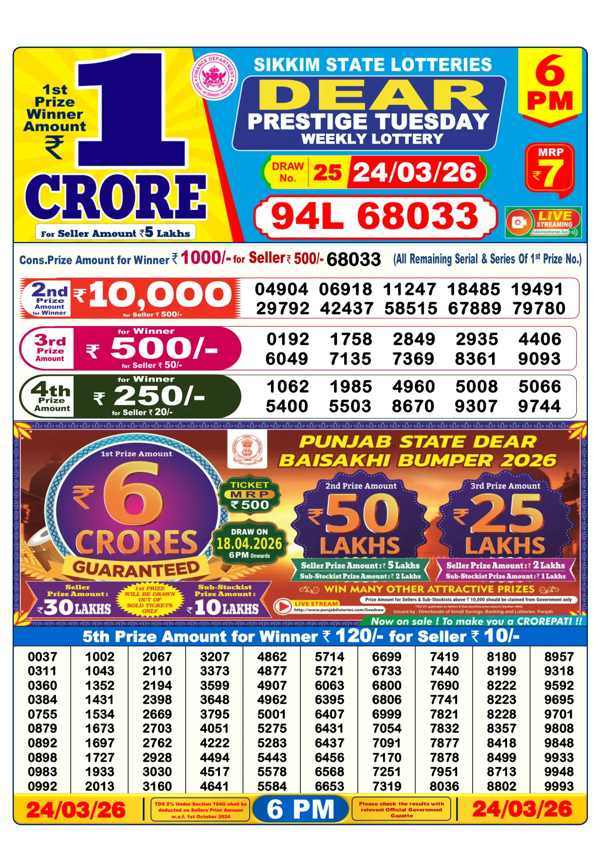 | 1st Prize | ₹1 Crore | 94L 68033 |