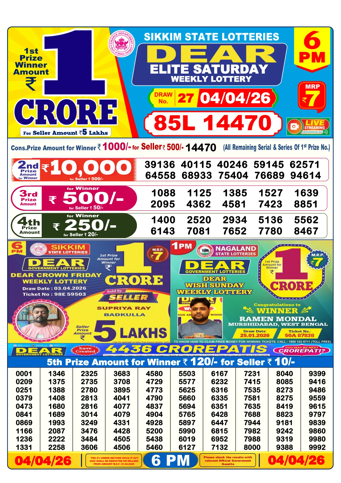Kohima, 4th April 2026 – The anticipation surrounding the 'Nagaland State Lottery - Dear Elite Saturday' draw for today, 4th April 2026, culminated in widespread jubilation for some fortunate ticket holders. Lakhs of participants across the nation eagerly awaited the results, and the draw certainly delivered life-changing news for the grand prize winner.