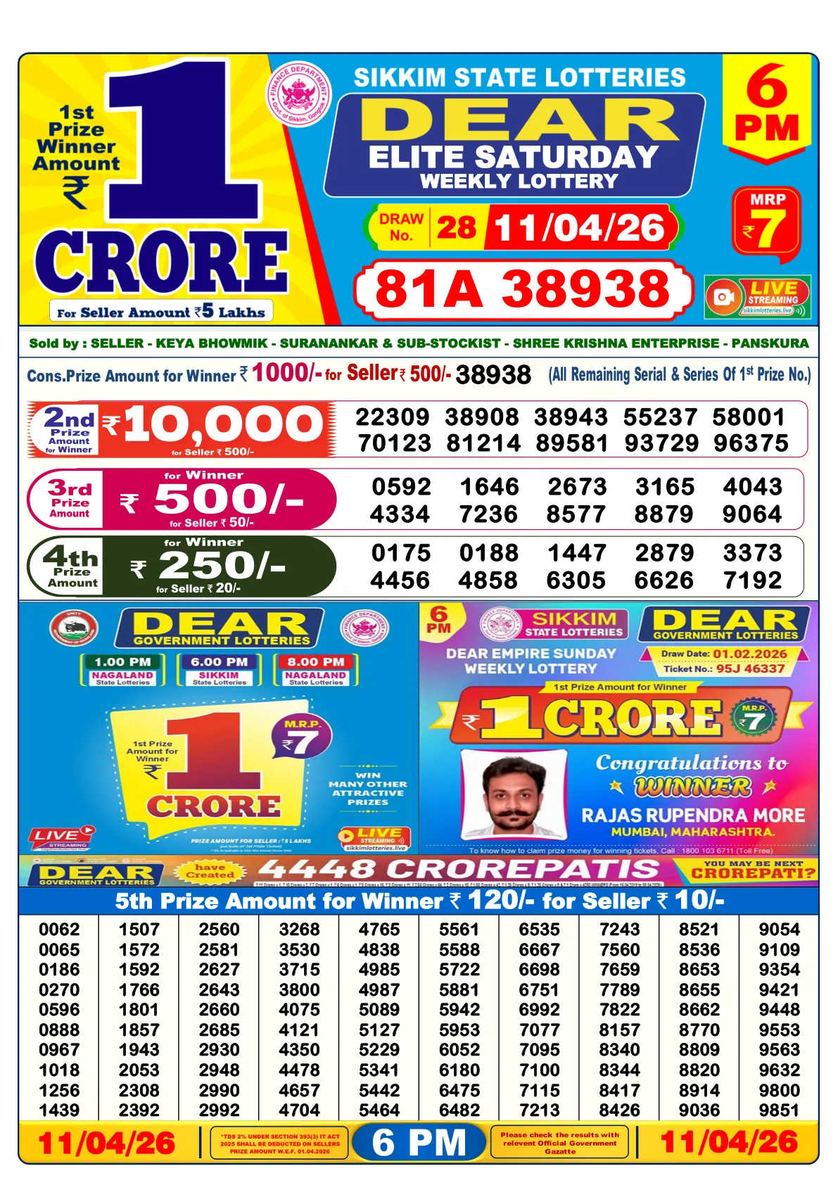 | 1st Prize | ₹1 Crore | 81A 38938 |