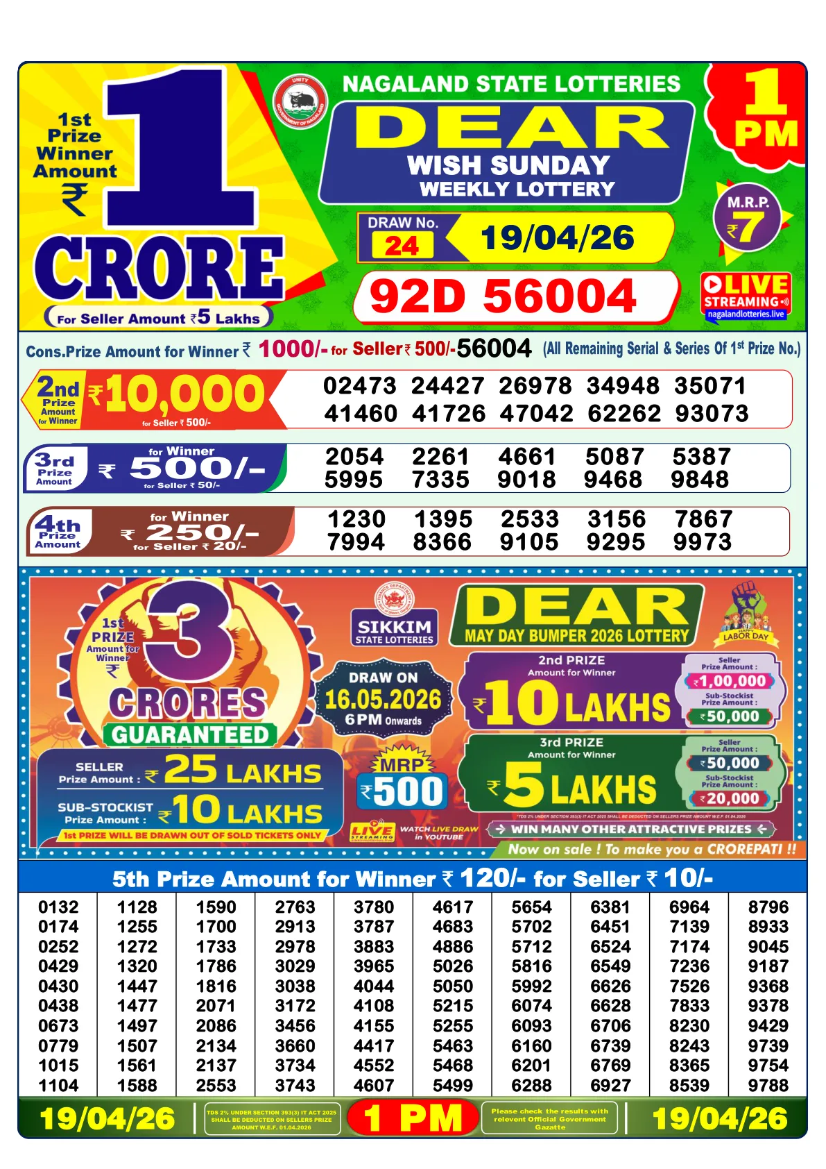 | 1st Prize | ₹1 Crore | 92D 56004 |